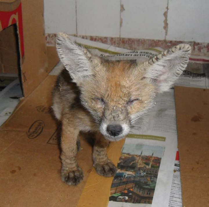 Sarkoptik uyuza yakalanmış tilki yavrusu