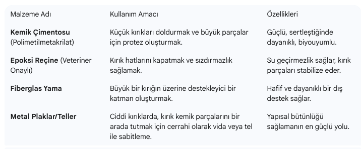 - Sabitleme ve Yapıştırma: Veteriner, kırık parçaları doğru hizaya getirir ve hareketi önlemek için sabitler. Bu sabitleme, kemik çimentosu (polimetilmetakrilat), epoksi reçine veya ciddi durumlarda metal plaklar/teller kullanılarak yapılır. Bu materyaller, kırık parçaları bir arada tutan ve yeni kemik/keratin dokusu oluşana kadar bir iskele görevi gören bir "iç alçı" görevi görür.