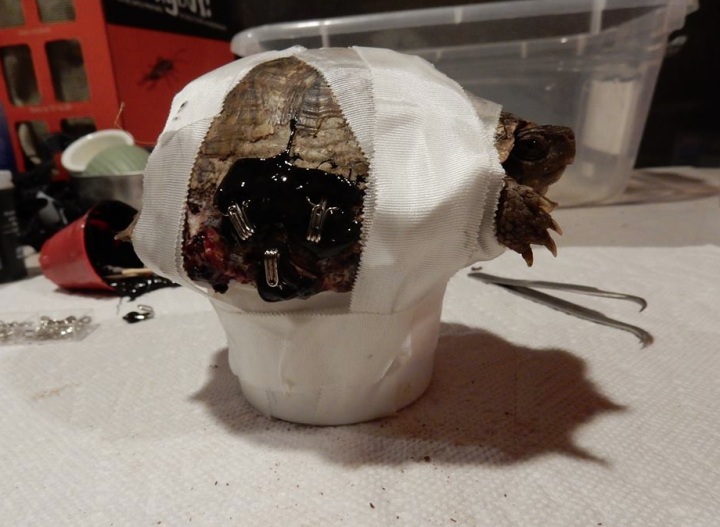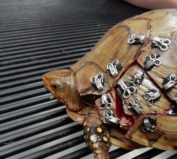 Veterinerler, kaplumbağa kabuğu tamirinde insan tıbbında kullanılan veya özel olarak geliştirilmiş biyouyumlu malzemeler kullanır: