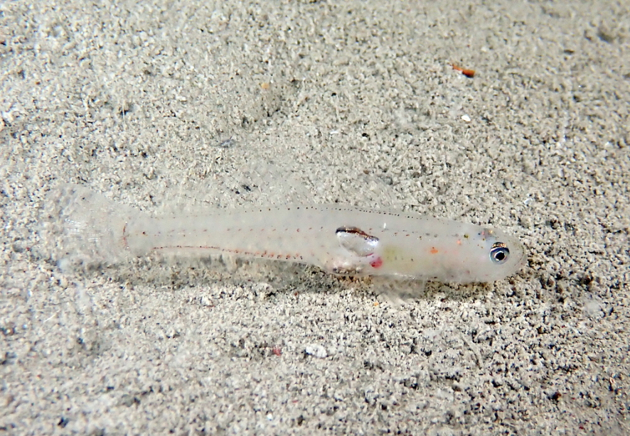 - Görünüm ve Pullar: Vücudu, neotenik (larval özelliklerin yetişkinlikte de sürmesi) yapısının bir sonucu olarak saydam ve camsıdır. Crystallogobius linearis'e benzer şekilde pulsuzdur. Vücudunda ve başın üstünde az sayıda kırmızımsı veya kahverengi kromatofor (pigment hücresi) bulunur, bu da ona hafif kırmızımsı bir ton verebilir.