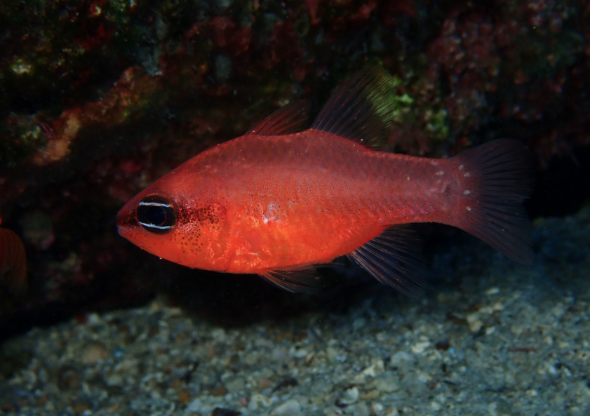 - Ayırt Edici Özellik: Vücudu ve yüzgeçleri parlak kırmızı veya pembe renktedir. Gözleri oldukça büyüktür (sciaphilous, yani gölge seven türlerin karakteristiği). Kuyruk yüzgecinin tabanında iki veya üç koyu nokta bulunabilir. Birinci sırt yüzgecinde genellikle altı belirgin diken bulunur (Bu, diğer Lesepsiyen kardinallerden ayıran önemli bir özelliktir).