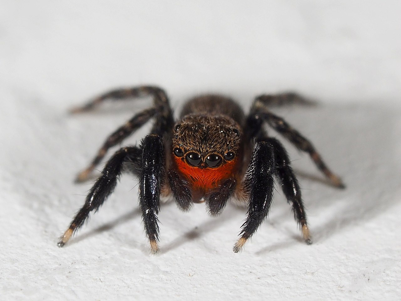 - Gözler: Salticidae familyasının en karakteristik özelliği olan güçlü gözlere sahiptirler. Ön ortadaki iki büyük göz, avı hassas bir şekilde takip etmelerini sağlayan üç boyutlu görme yeteneği sunar. Diğer altı göz çevresel hareketleri algılar ve geniş bir görüş alanı sağlar.