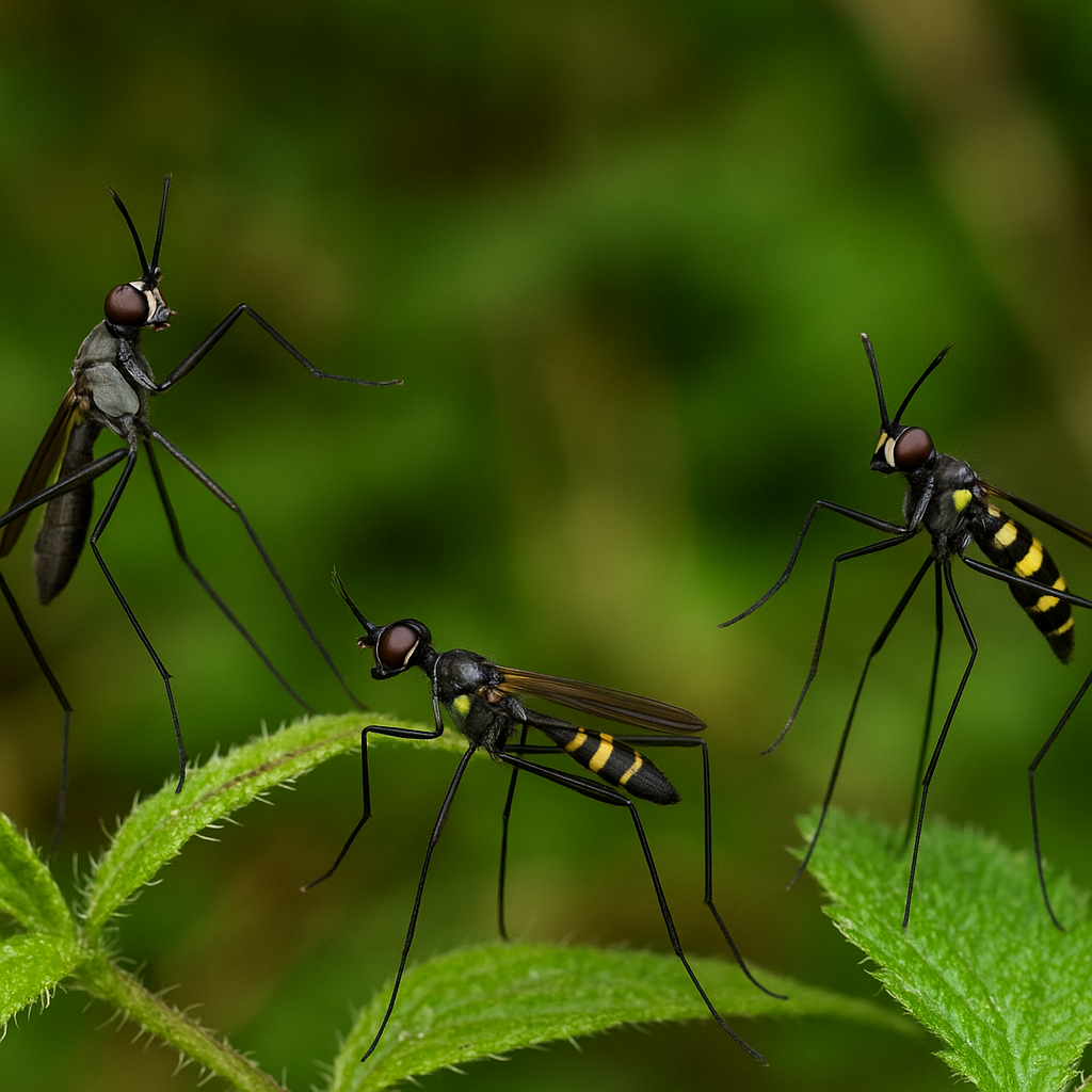 (Uzun, ince bacakları ve karakteristik duruşlarıyla tanınan; bazı türleri karınca veya yaban arısı taklidi yapan ve genellikle orman açıklıklarında görülen sıra dışı bir sinek familyası.)