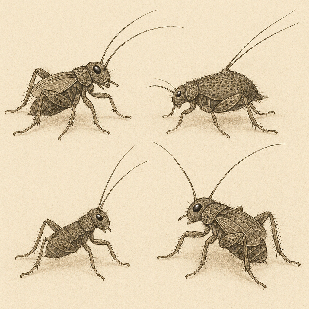 (Küçük, zıplayıcı yapılı, kepeksi pullarla kaplı vücutlarıyla tanınan; tropikal ve subtropikal bölgelerde yaygın Ensifera familyası.)