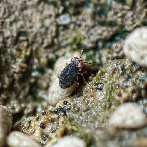 Açıklama: Omaniidae familyasından bir su böceği (muhtemelen Omania cinsinden), taşlı dipte yürürken görülmektedir.