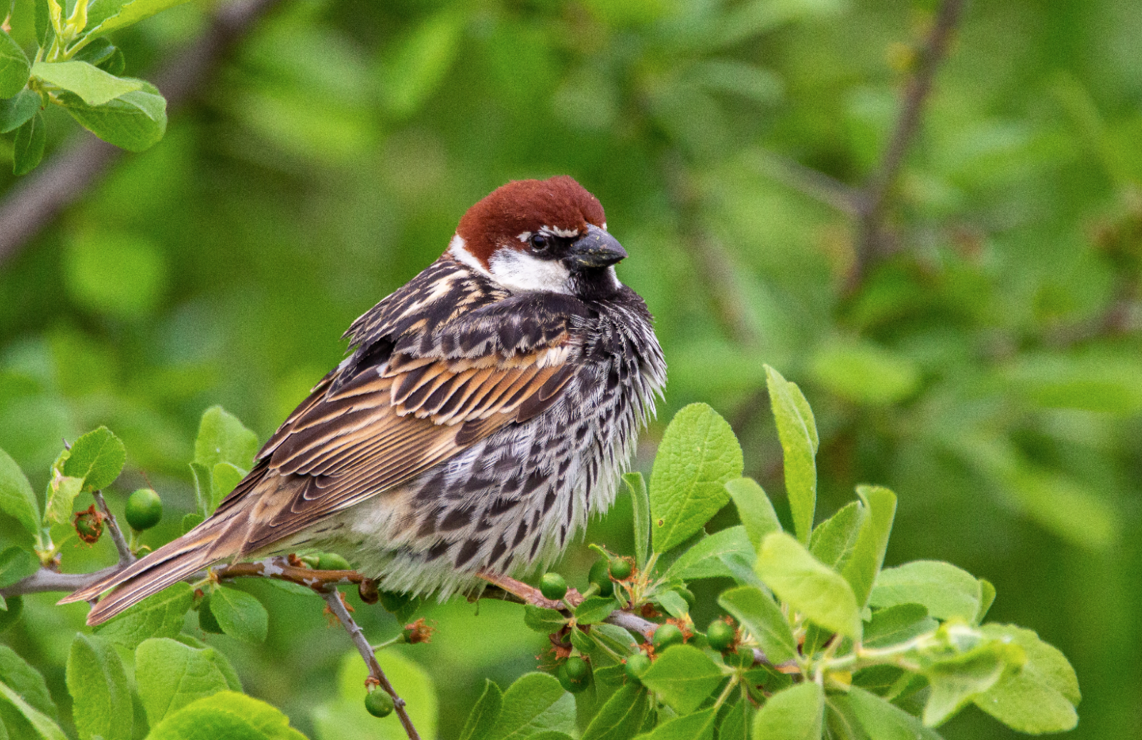 - Erkek (Üreme Dönemi) (Ayırt Edici Özellik): Erkeğin tüy deseni, onu Ev Serçesi'nden net bir şekilde ayırır: