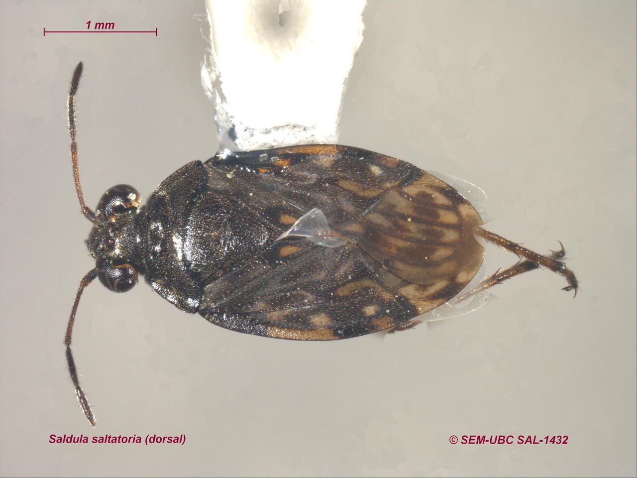 Dorsal (üstten) görüntü – Saldula saltatoria (ölçekte 1 mm işaretli)