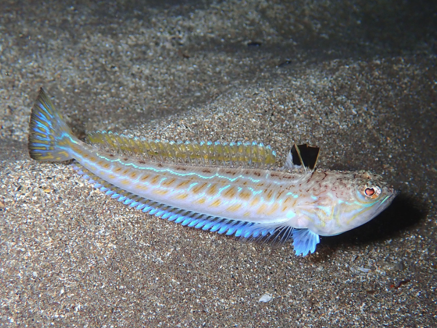 - Morfoloji ve Renklenme: Vücudu uzundur ve yanlardan hafifçe yassılaşmıştır. Baş kısmı büyük, yassı ve basıktır. Gözleri kafasının üst kısmına yakın konumlanmıştır. Rengi genellikle kum zeminle uyumlu olarak yeşilimsi-kahverengidir ve yanlarında belirgin sarımsı-beyaz eğimli çizgiler bulunur.