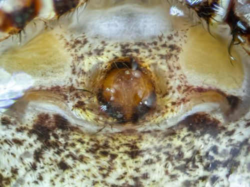 - Bacaklar: İlk iki çift bacak diğer yengeç örümceklerinde olduğu gibi daha kalın ve güçlüdür, avı yakalamak için yana doğru uzanır. Bacaklar genellikle koyu benekli veya halkalıdır.