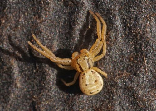 - Bacaklar: İlk iki çift bacak diğer yengeç örümceklerinde olduğu gibi daha kalın ve güçlüdür, avı yakalamak için yana doğru uzanır. Bacaklar genellikle koyu benekli veya halkalıdır.
