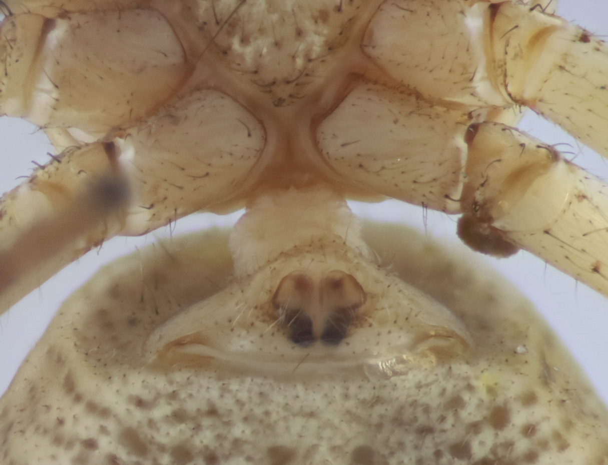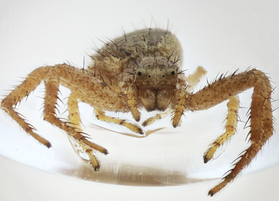 - Bacaklar: İlk iki çift bacak diğer yengeç örümceklerinde olduğu gibi daha kalın ve güçlüdür, avı yakalamak için yana doğru uzanır. Dişilerde bacakların ana rengi açık kahverengi olup ince koyu lekelerle kaplıdır. Ön bacaklar koyu renktedir ve tibiaları düzenli bilezik benzeri koyu-açık-koyu halkalıdır. Erkeklerde ise ilk iki çift bacak kalçadan tibiaların üst kısmına kadar neredeyse siyahtır ve kalınlaşmıştır, arka bacaklar açık renkli olup eklemlerde ince koyu halkalar bulunur.