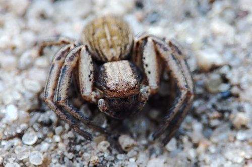 - Genel Görünüm: Renkleri genellikle kahverengi, gri veya bej tonlarında olup, üzerinde koyu ve açık lekelerden oluşan karmaşık, alacalı desenler bulunur. "Striatipes" adı, bacaklarında belirgin çizgiler veya bantlar bulunabileceğini düşündürür. Bu renk ve desenler, örümceğin bulunduğu toprak, taşlar veya bitki döküntüsü arasında mükemmel bir kamuflaj sağlar.