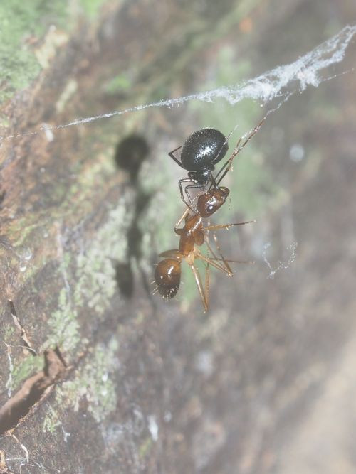 - Avlanma Davranışı: Bu örümcekler, ana dağılım alanları olan Doğu Asya'daki ormanlık alanlar, çalılıklar ve bahçeler gibi çeşitli habitatlarda bulunurlar. Küçük böcekleri (sinekler, yaprak bitleri, diğer küçük eklembacaklılar vb.) avlarlar. Ağlarına takılan avları, Theridiidae familyasına özgü olan dördüncü bacak çiftindeki taraklı yapıyı kullanarak ipekle sarar ve zehirleyerek etkisiz hale getirirler.