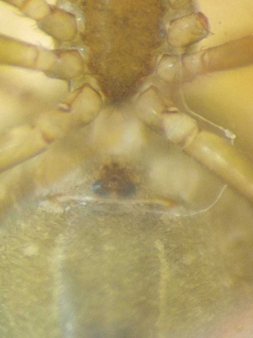 - Genel Görünüm: Karapaks (baş-göğüs kısmı) sarımsı gri renkte olup, genellikle trident (üç çatallı) bir desene sahiptir ve baş bölgesi hafifçe kalkıktır. Sternum (göğüs plakası), labium ve maksiller de grimsi sarı renktedir.
