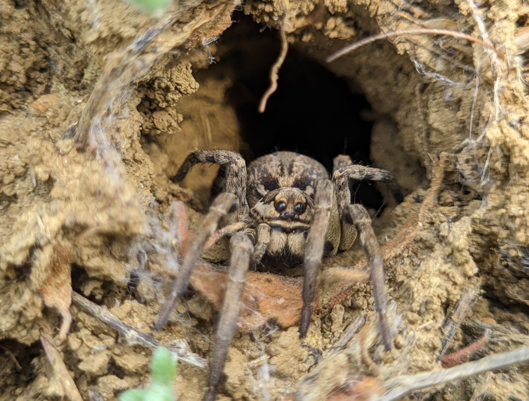Yuva Yapısı ve Yaşam Alanı: Lycosa praegrandis, yeraltında yaşayan bir örümcektir. Genellikle 20 cm derinliğe ve 25 mm çapa kadar inebilen, ipek astarlı dikey tünel yuvalar kazarlar. Bu yuvalar, örümceği dış etkenlerden (aşırı sıcaklık, kuraklık) ve avcılardan korurken, aynı zamanda avlarını pusuya yatırabileceği güvenli bir sığınak sağlar. Yuva girişleri genellikle kamufle edilmiştir.